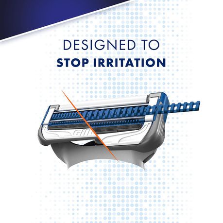 Gillette's first clinically proven razor designed for sensitive skin, with SkinGuard technology between the blades. Gillette SkinGuard men's blade refills have a unique SkinGuard between the blades to shave hair and guard skin. The SkinGuard reduces blade contact with the skin. Each blade refill also Features: 2 optimally- spaced, low cutting force blades to minimize tug and pull, and lubrication before and after the blades to minimize friction and shield skin from irritation.