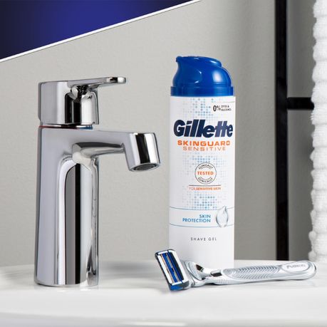 Gillette SkinGuard Sensitive men's shaving gel, with a touch of aloe, cools to soothe, helps your razor glide smoothly over your skin, and helps protect skin during the shave.