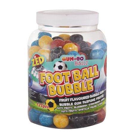 125 pieces in one jar of hard Candy soccer balls with a bubblegum centre and in assorted fruit flavours.