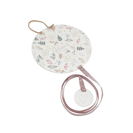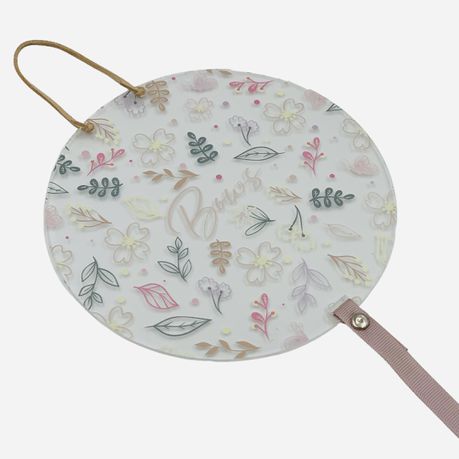 - Clear Acrylic Circle 160mm (3mm depth) with printed floral and "Bows" design.