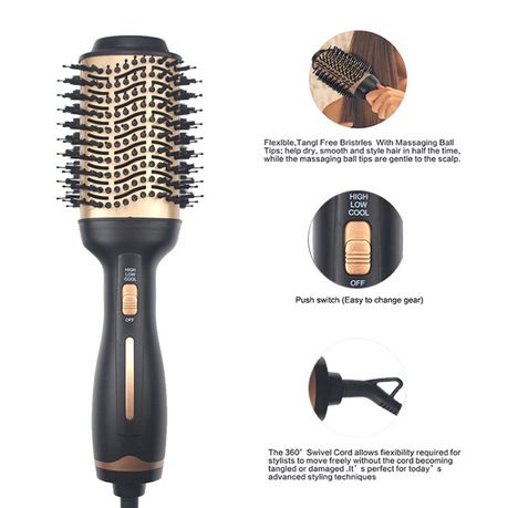 Tangle-free tufted bristles, nylon pin, and unique airflow vents. The bristles have massaging balls on the tip to help dry, smooth, and style hair in HALF the time while the massaging ball tips are gentle to the scalp.