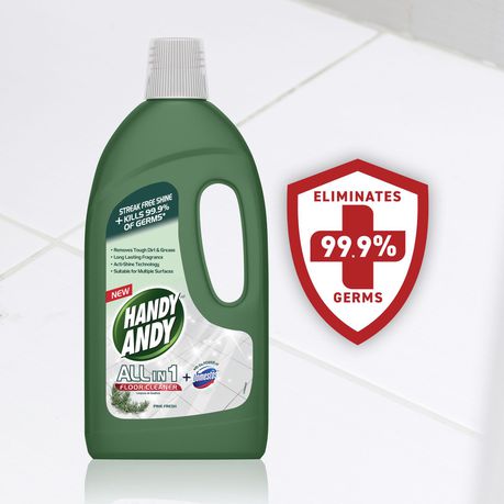 Handy Andy Pine Fresh All in 1 Floor Cleaner gives your floors an impeccable shine and 99.9% germ kill all around your home. It is specifically formulated to cut through stubborn dirt and grease on floors providing a streak clean shine. Handy Andy Pine Fresh All in 1 floor cleaner contains acti-shine technology, is suitable for multiple surfaces and provides your home with a fresh long-lasting fragrance. All in 1 floor cleaner with the power of Domestos. With Handy Andy floors, you can enjoy a home that looks and smells great. Handy Andy develops cleaning products that solve the problems you face, while caring for surfaces at the same time. Handy Andy all-purpose floor cleaner will help you achieve the beautiful results you want: whatever the surface, whatever the room, whether it's a quick spruce-up, or a full deep clean.