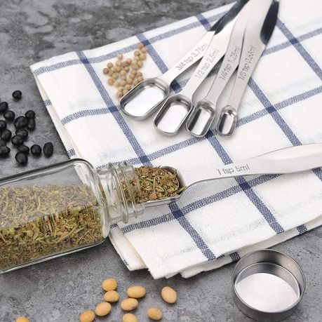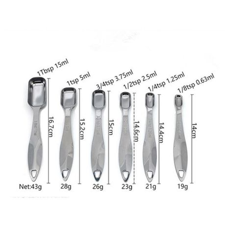 Professional cooking: Set Contains 6 spoons: 1/8-tsp, 1/4-tsp, 1/2-tsp, 1-tsp, 1/2-Tbsp, and 1-Tbsp.