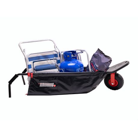 Ergonomically designed to put the weight close to the wheel for easier lifting. It has a low center of gravity resulting in less “trippiness”. Ground-level loading means you can roll, push or rake straight into the tray. And once you are done, empty with very little effort... over the front, out the side or pour off the back, whatever style you prefer. One more thing, it has grips on the powder-coated metal frame making it more comfortable on your hands - no more hot handles. Ok one more thing, it has a useful dry pocket for your cell, keys, wallet or passport.