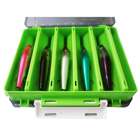 The ILURE Reversible 10 Space Tackle Box is a hard tackle box that is capable of storing 10 lures. The box has compartments on either side for storage and latches that open each compartment.