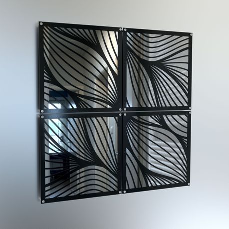 With 4 laser metal cut panels, perfectly finished in the best black there is, our own Unexpected Black! With 4 laser cut mirror acrylic backings that all get assembled with the metal standoffs and easily mounted using your neighbors drill and included drill template.