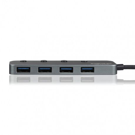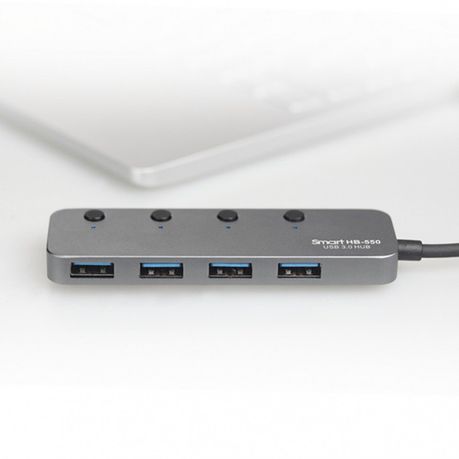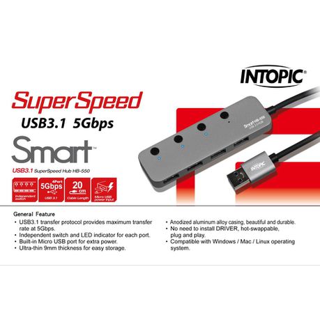The Intopic HB-550 is a High speed USB3.1 Hub with 4 USB ports on the USB Hub which is connectable to any device with a USB-A port like a laptop. It has independent switches and indicators for each port making it easy to control which items that are required to be connected at any one time. The cable between the hub and the USB-A connector is 20 cm long enough to rid the desk of cable clutter.