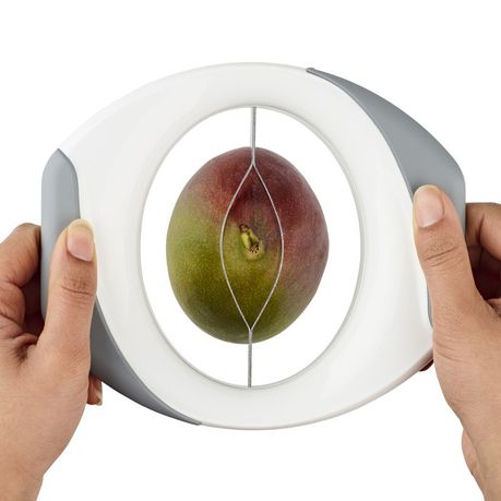 The practical mango slicer cores, cuts and peels the mango in seconds. The micro-serrated stainless steel blade cuts through the mango with ease and leaves only the core. The blade shape is perfect for different sizes of cores. The soft-touch handle for a good and secure hold. Dishwasher-safe.