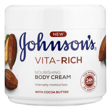 Enriched with skin-loving cocoa butter and moisturising glycerin, Johnson's Vita-Rich Nourishing Body Cream intensely moisturises and nourishes your skin and keeps it comfortable for 24 hours.