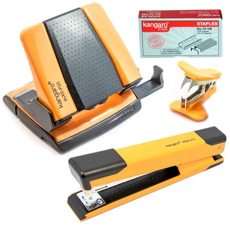 Kangaro desktop starter kit offers all you need for any office/ Kangaro offers a range of stylish colours and quality metal products/ Kangaro NXTP25 Punch offers a 25 sheet punch capacity/ Paper tray and plastic guide/ Kangaro HDM210 offers a 30 sheet stapling capacity/ Full metal body stapler/ Takes 26/6 standard staples/ Kangaro SRL45 stapler remover metal teeth/ Free pack of Kangaro No.10 staples