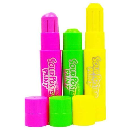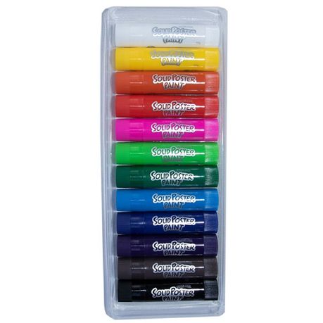 One pack with 12 different colours solid poster paint crayon sticks. Red, yellow, white, orange, pink, lime, green, blue, dark blue, purple, brown and black. No water needed, bright colours, high covering power, quick drying, washable. Special for school use. For drawing and painting in a fun, easy and clean way. for painting on paper, cardboard, wood etc. Instant application with no need for water. Saves Time. Very practical and clean. Silky finish. Protective glaze not necessary. Solvent Free. Easy to use: Uncap, rotate the base to make the stick come out and draw.