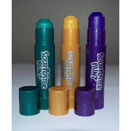 One pack with 6 different Metallic colours solid poster paint crayon sticks. Purple, blue, green, pink, silver, and gold. No water needed, bright colours, high covering power, quick drying, washable. Special for school use. For drawing and painting in a fun, easy and clean way. for painting on paper, cardboard, wood etc. Instant application with no need for water. Saves Time. Very practical and clean. Silky finish. Protective glaze not necessary. Solvent Free. Easy to use: Uncap, rotate the base to make the stick come out and draw.