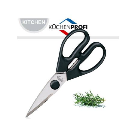 The Küchenprofi Kitchen Sscissors are made of titanium coated stainless steel. The sharp serrated blades easily cut herbs but also slice through cardboard boxes and other material packaging. The scissors conveniently separate for simple washing.