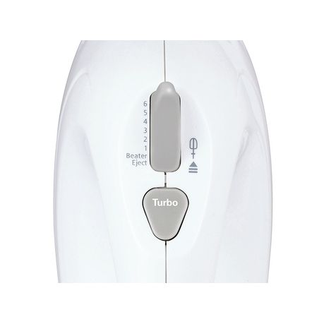 Compact design with a convenient thumb operated 6-speed control with turbo button. Also Features safety interlocked beater release system, stainless tools, stand and mixing bowl