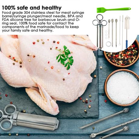 Food-grade 304 stainless steel for meat injector barrel/syringe plunger/meat needles, BPA-free and FDA silicone for BBQ brush and O-ring seals, 100% food safe for parts touching marinade/food ingredients, to keep your family safe and healthy.