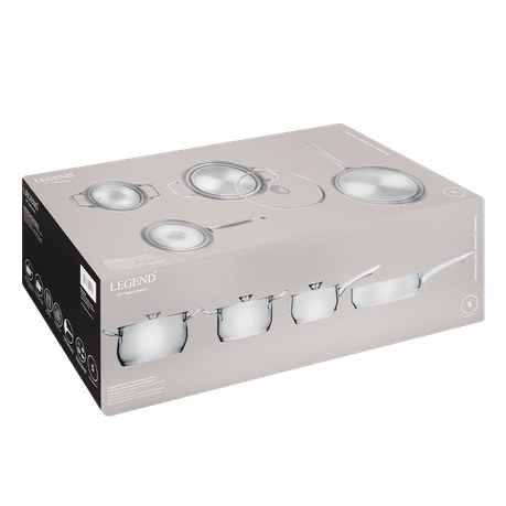 The Legend Master Chef 7pce Cookware set is made using high quality 201 Stainless Steel and ideal for creating that gourmet meal. The 3mm Layer encapsulated base allows for quick and even heat distribution and is suitable for all hobs including induction. The cookwares has been designed with a belly shape to increase the capacity of the pot and has welded cool touch Stainless Steel handles and knobs. The cookware set features a mirror polished interior and exterior finish. The set is dishwasher and oven safe without the lids.