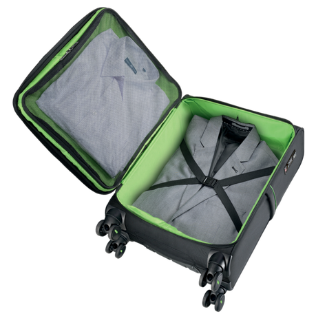 High-quality and lightweight business trolley with a spacious main compartment and a smaller front compartment. Allows separation of work materials and laundry. Comfortable travel and easy guidance with the smooth-running 4-roller system and telescopic pole with double linkage.