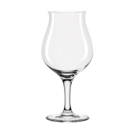 - This long-stemmed tulip beer glass is the typical shape for serving elegant, full-bodied brews.