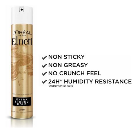 L'Oreal Paris Elnett hairspray offers your hairstyle long-lasting hold with a brilliant shine and a soft touch. Its unique micro-diffused spray is ultra-fine and disappears at the stroke of a brush, leaving hair feeling clean, soft and shiny. It sets your hair without stiffness and lightly brush your hair to remove the hairspray. The finest hairspray used by the finest stylists.