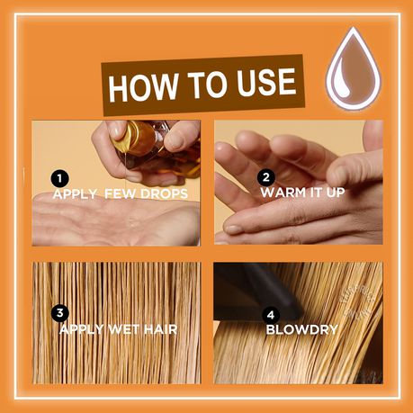 Apply serum before styling to prevent styling damage, after styling for enhanced shine or before washing for intense nourishment. Apply 3 or 4 drops in the palm of your hand, massage into hands before spreading the oil evenly through the lengths and ends of your hair.