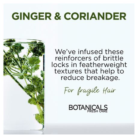 Carefully crafted for fragile hair. The formula strengthens and revitalises the feel of hair from root to tip. Infused with a fresh, invigorating aroma. Free from silicones, parabens and colorants. L'Oreal Botanicals Coriander Fragile Hair Strengthening is infused with a concoction of coriander, soya and coconut oils.
