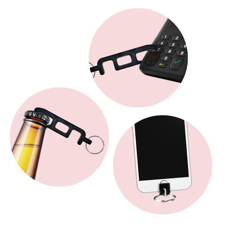 - Multifunction Cellphone Hook Keyring, can be used as a Cellphone Stand, Touchless opening of doors or use of keypads or as a Bottle Opener