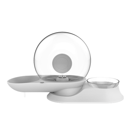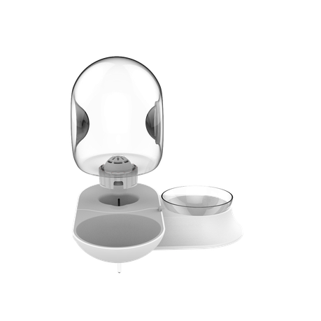 Modern snail shaped food and water dispenser suitable for dogs and cats. Easy to clean. Holds 2.8L of water and includes a bowl for food.
