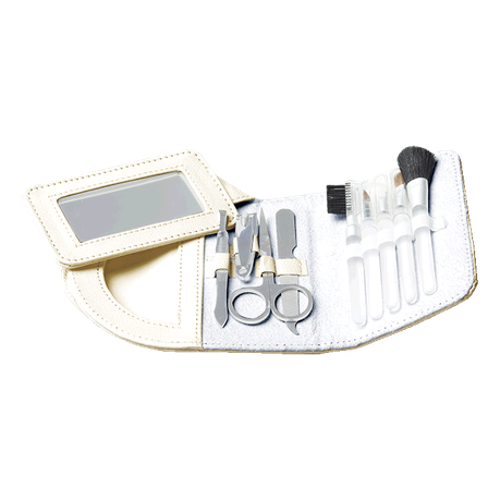 - Tools: Tweezers, nail clippers, nail scissors, nail file, lash & brow comb, small brush, eyeshadow applicator, eyeshadow brush, blusher brush