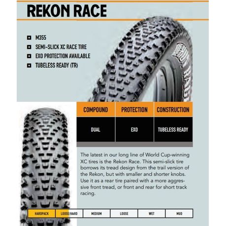 The latest in our long line of world cup-winning xc tyres is the rekon race. This semi-slick tire borrows its tread design from the trial version of the rekon, but with smaller and shorter knobs. Use it as a rear tire paired with a more aggressive front tread, or front and rear for short track racing.