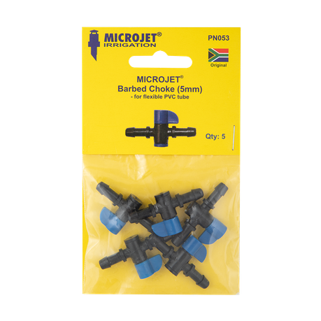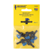 Microjet Chokes are used in conjunction with 5mm Flexible PVC Tube or with Rigid Risers to restrict the volume of water passing through the tube. They are ideal for areas, such as potplants, where the watering amount might need to be adjusted to fit a certain area. Microjet Chokes also solve the problem of plants that require differing amount of water at different times of the year. With a Microjet Choke installed that line or riser can simply be switched off when not needed.