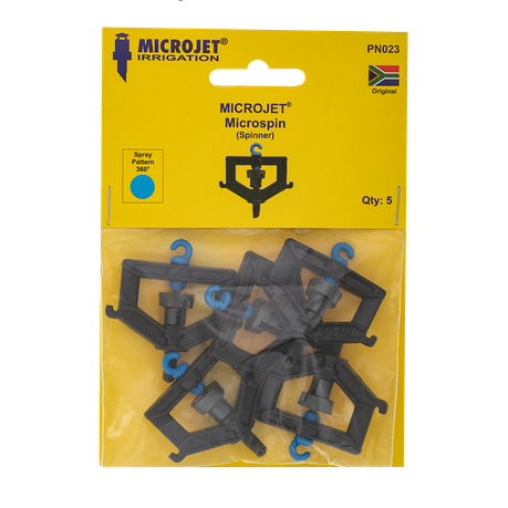 As its name implies the Microjet Microspin is a highly accurate and efficient small sprinkler with a spinning rotor. Unlike many other spinners on the market today, the Microspin has a double-sided frame and not a single legged “G” shape, to give it extra strength and to ensure that the rotor runs straight. The rotor has a double throw and has aerodynamic design which makes it suitable in high wind conditions. Single pole rotors with an “arm” sticking out to the side tend to be badly effected by wind.