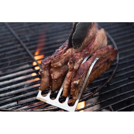 Rashers griller aka the Fat tanner is used to render the fatty portions of the meet or to get that perfect crispiness with out over cooking the rest of the meat, great for your thinner cuts like rashers, etc. No more need to try and balance or hold your desired meat with a tong. Tan that fat to perfection. Multipurpose, use it for anything else that can slide in the grooves e.g. tongs, knives. serviettes etc. Designed with stainless steel which allows you to bend the structure for shorter or longer cuts of meat. The ribs are 1cm wide, place thicker meats on the side. Place on top of your grill and closest to your desired heat. No direct contact whilst hot, use utensil to move.