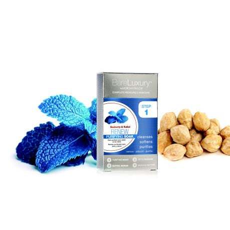 Professional results served up in convenient, sanitary packets. It is a complete 4 step system in every box. Bare luxury Complete Manicure and Pedicure Range: Renew Sea berry and Kukui including Purifying Soak 28g, Detox Masque 20g, Salt Scrub 20g and Massage Butter 15ml