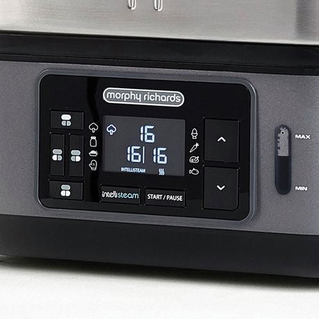 1600W Large 6.8L capacity 2x Stainless steel steaming trays Toughened glass lids with Stainless steel trim Painted main body Tray divider included 3 separate steamer chambers 3 boilers Digital LED screen Manual time control Pre-set food time programs Intellisteam sync or no sync option Water level indicator BPA free Cool-touch plastic handles Added accessories – Steaming shelf, rice bowl and sauce tray