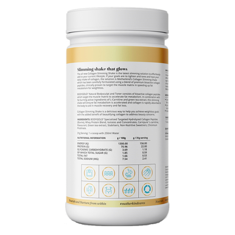 The all-new Collagen Slimming Shake is the latest slimming solution to effortlessly add to your current lifestyle. If your goals are to tighten and tone and have your daily intake of collagen, the solution is Motherkind’s Collagen Slimming Shake which has been carefully formulated using a blend of premium bioactive collagen peptides, clinically proven to target the muscle matrix in speeding up fat metabolism for weight loss. Bodygold Natural Body-sculpt and Toner consist of bioactive collagen peptides that target the muscle matrix to accelerate the fat metabolism. In combination with fat burning active ingredients of L-Carnitine and green tea extract, this slimming shake will ensure fat metabolism is accelerated and collagen is rapidly absorbed in the body to aid in muscle recovery and fat loss. Collagen Slimming Shake is a delicious way to help you achieve weight loss goals with the added benefit of beautifying collagen to address beauty concerns.