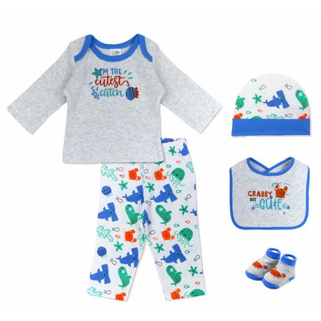 These adorable set of 5 pieces Layette consists of a bodysuit, a hat, socks and pants. The baby bodysuit included expandable envelope neckline for easy dress and snap closure buttons at the bottom for speedy diaper change. Come with a hat to keep baby warm and makes the complete ensemble