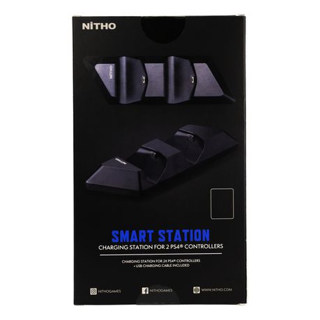 Smart Charging Station compatible with PS4 DualShock Controllers. Two cradles allow you to recharge two PS4 controllers at the same time and a Charging USB cable is included to connect to the console.