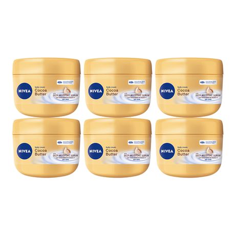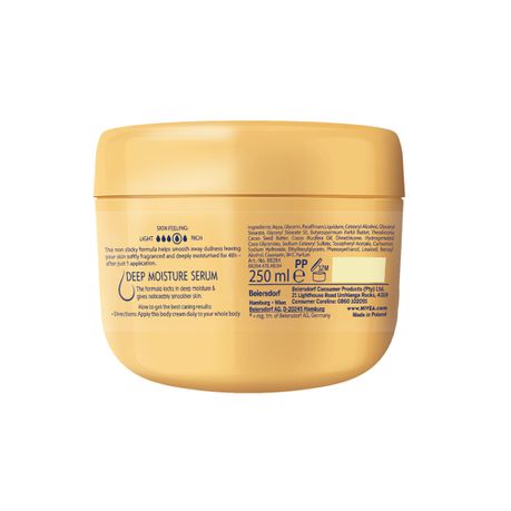 The Cocoa Butter body cream transforms your dry skin into deeply moisturised and noticeably smoother skin for 48h. Infused with the NIVEA DEEP MOISTURE SERUM and precious cocoa butter and vitamin E. The body cream provides moisture and smoothes away dullness for 48h - leaving your skin nicely fragranced with a scent of cocoa - after just 1 application.