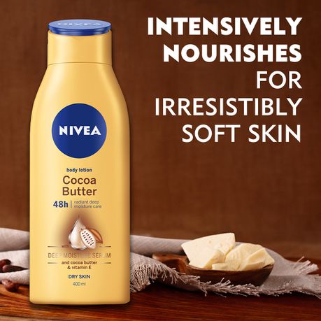 The Cocoa Butter body lotion transform your dry skin into deeply moisturised and noticeably smoother skin for 48h. It is infused with the NIVEA DEEP MOISTURE SERUM and precious cocoa butter and vitamin E. The body lotion provides moisture and smoothes away dullness for 48h - leaving your skin nicely fragranced with a scent of cocoa - after just 1 application.