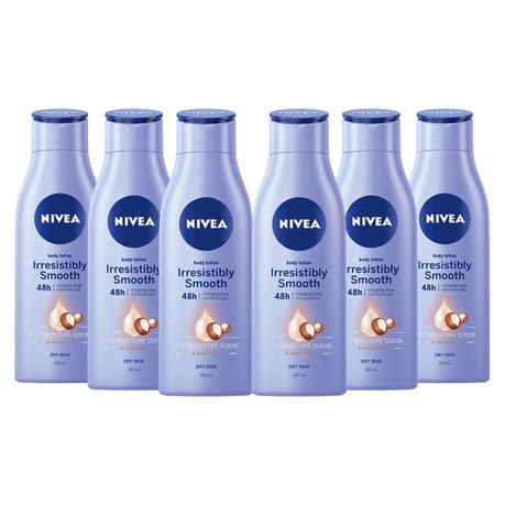 The Irresistibly Smooth body lotion transform your dry skin immediately into a noticeably smoother skin for 48h. The Irresistibly Smooth body lotion is infused with the NIVEA DEEP* MOISTURE SERUM and precious shea butter. It melts gently into your skin leaving it smooth to touch and deeply moisturized for 48h - after just 1 application.