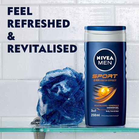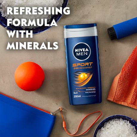 A caring formula and masculine lime scent give long-lasting freshness. NIVEA MEN Sport Shower Gel/ Body Wash with 24H FRESH EFFECT.