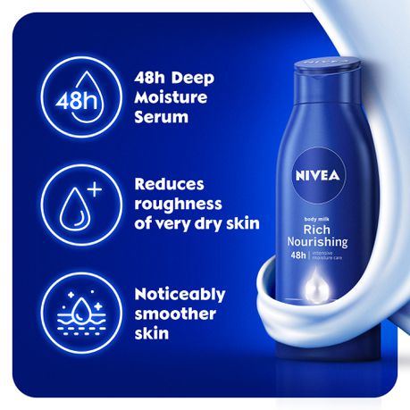 NIVEA Rich Nourishing Body Lotion transforms your dry to very dry skin into deeply moisturised and noticeably smoother skin for 48h.