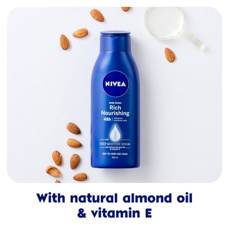 Beautiful smooth skin starts and ends with NIVEA Rich Nourishing Body Lotion. Designed for dry to very dry skin, this nourishing body lotion reduces the roughness of dry skin after just one application. Infused with NIVEA Deep Moisture Serum, natural almond oil and vitamin E, it’s formulated with the perfect combination of high-quality ingredients found in the NIVEA body lotions and creams you know and love, together with the NIVEA Deep Moisture Serum. The body lotion absorbs into the skin, locking in moisture and providing deep moisture for up to 48 hours for an effect that you can feel and see.