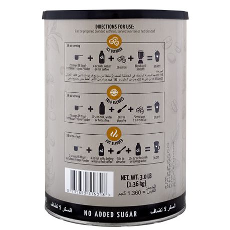 The instant frappe powder is sweetened with erythritol and sucralose (Splenda), containing the perfect balance of sweetness and flavor.