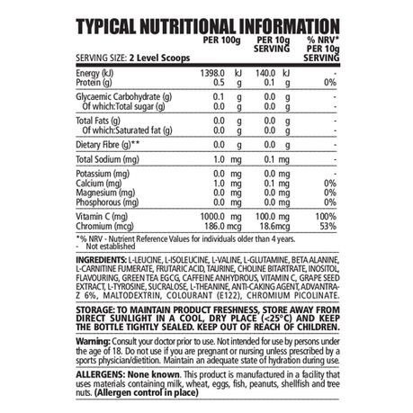 - As a dietary supplement, mix 1-2 level scoops (approx. 5-10g) with 150 - 250ml of cold water and consume 10 minutes before training. On non-training days, consume 1-2 servings daily to enhance fat loss and boost energy. Do not consume more than 3 servings in a 24-hour period. Due to high stimulant content, do not consume after 16:00