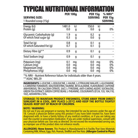 - As a dietary supplement, mix 1 rounded scoop (approx. 15g) with 250-300ml of cold water and consume 30 minutes before training. To increase lean muscle and enhance muscle recovery consume as a pre-workout, intra-workout or post workout. Additional servings may be consumed throughout the day depending on energy requirements or as recommended by your fitness advisor