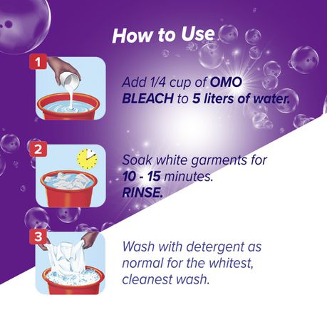 Add 1/4 cup of OMO foaming bleach to 5 litres of water and soak white garments for 10 - 15 minutes. Rinse and then wash with detergent as normal for the whitest, cleanest wash.