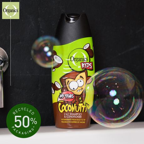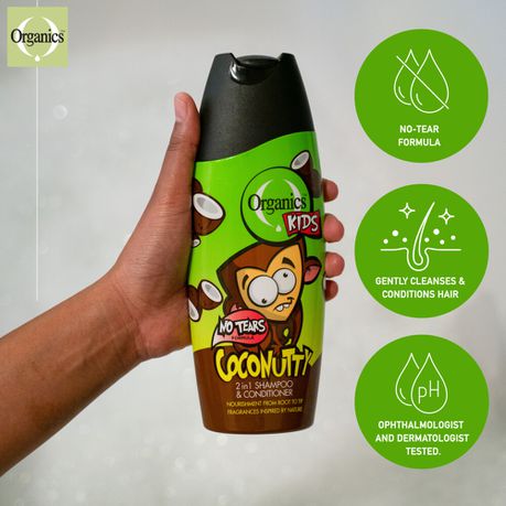 Organics Hair Shampoo Coconutty 2 In 1 shampoo and conditioner gently cleanses and conditions your child’s hair and scalp.;Cares for your little one’s hair and scalp.;A hypoallergenic kids shampoo conditioner.;Ophthalmologist and dermatologist tested.;Special no-tears kids shampoo and conditioner formula.;Contains fruit extracts and a fragrance inspired by nature.