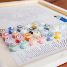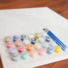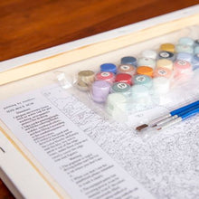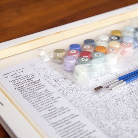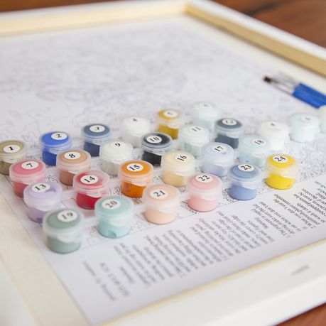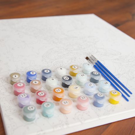 The canvas is mounted on a wooden frame and ready to be hung on the wall. The kit includes hanging hooks, paint brushes and paint jars.