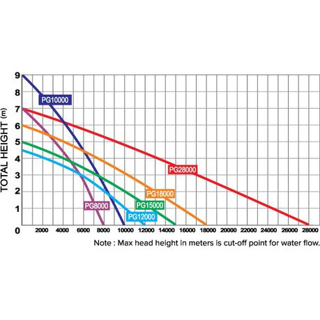 - Max Head / Water Cut-Off Height is at 5.0m. Please refer to the supplied Height / Flow Chart to determine the flow capabilities of the pump.